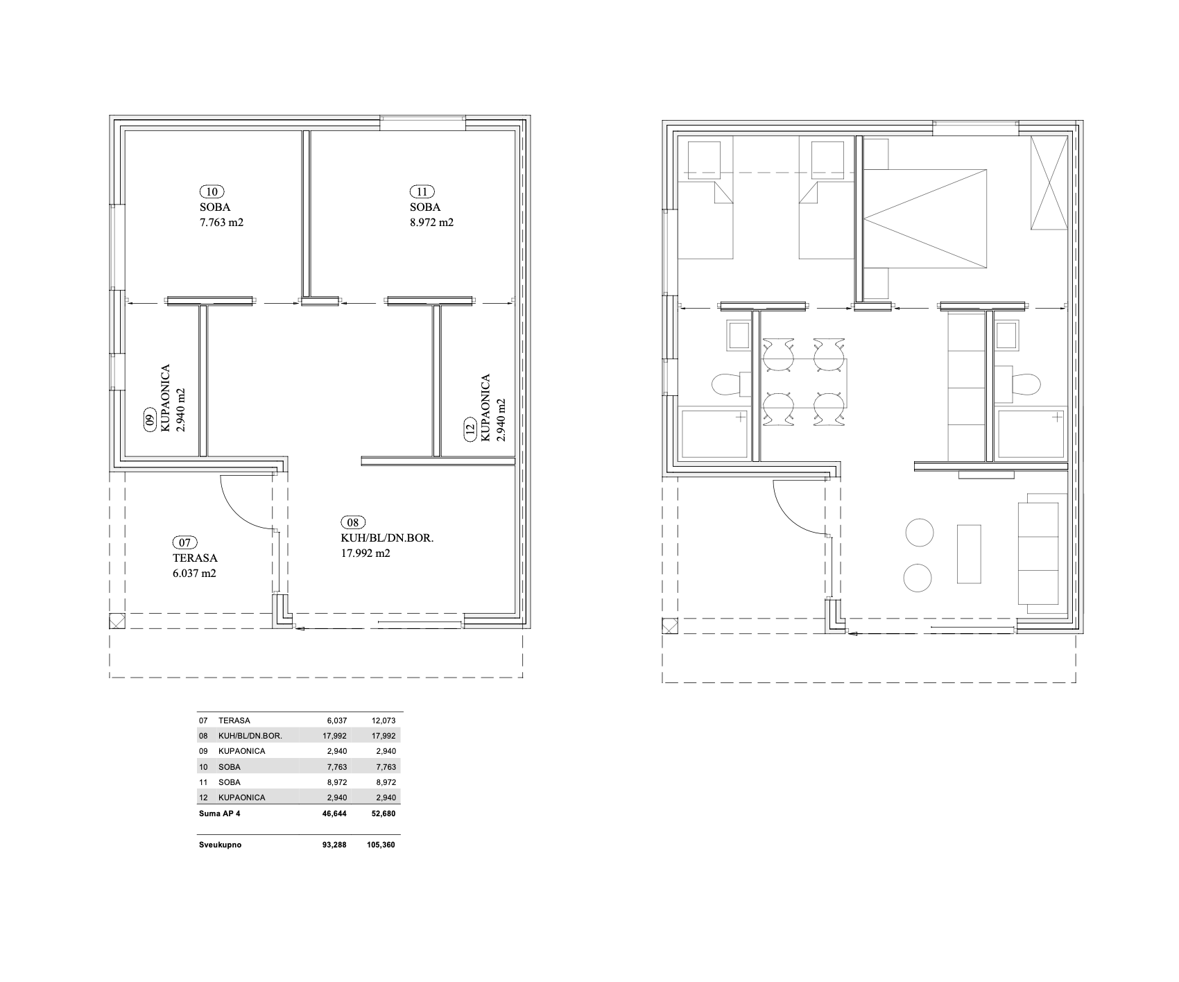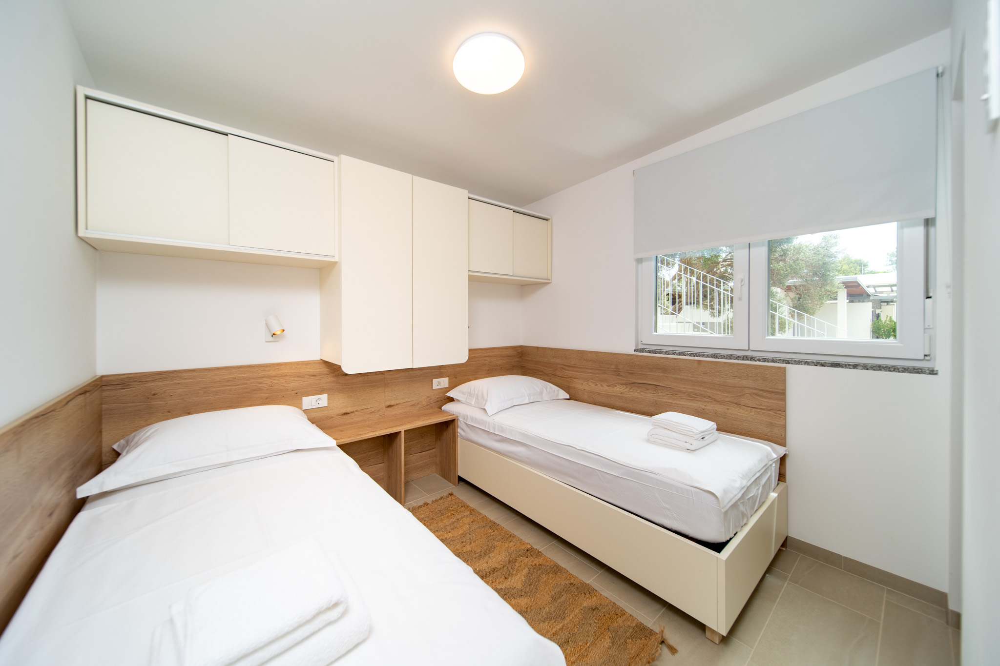 Dnevni boravak sa sofom na razvlačenje +TV, spavaća soba s francuskim krevetom i ormarom, soba s dva odvojena kreveta i ormarom.